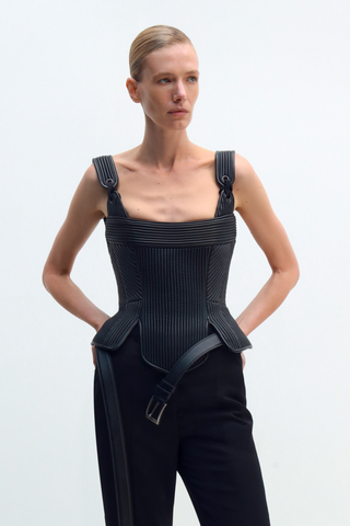 BUSTIER TOP IN AN EXCLUSIVE HANDMADE TECHNIQUE, WITH STRAPS TIED FRONT AND BACK WITH RIBBONS. ZIP AND LACE-UP CLOSURE. A REFINED PIECE FOR A MODERN, SOPHISTICATED SILHOUETTE.