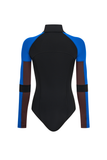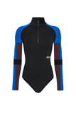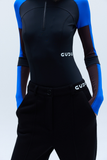 BODYSUIT WITH STAND COLLAR AND LONG SLEEVES. SEAMS FOLLOW THE BODY’S SILHOUETTE. FRONT ZIP AND HOOK-AND-EYE CLOSURE AT THE CROTCH.