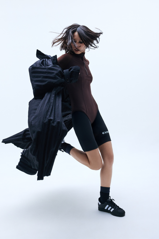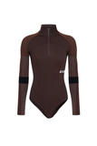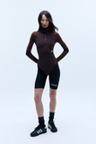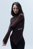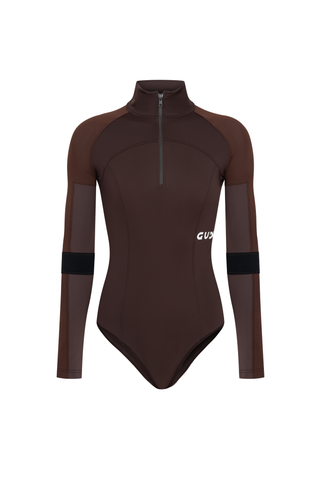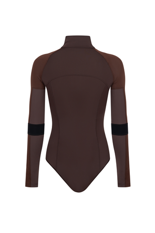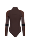 BODYSUIT WITH STAND COLLAR AND LONG SLEEVES. SEAMS FOLLOW THE BODY’S SILHOUETTE. FRONT ZIP AND HOOK-AND-EYE CLOSURE AT THE CROTCH.