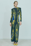 KNITTED MAXI DRESS WITH EXCLUSIVE BRAND'S PATTERN, VOLUME SHOULDERS, ZIP FASTENING AT THE BACK