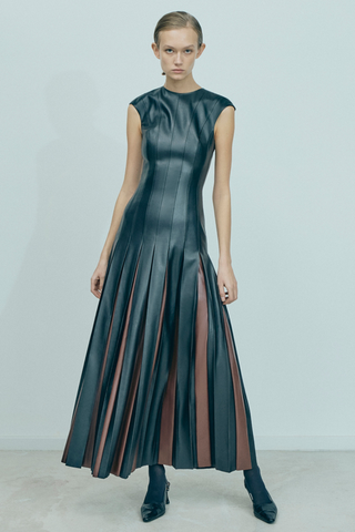 MAXI DRESS WITH DECORATIVE TOP AND PLEATED BUTTON WITH INSERTS OF BROWN ECO LEATHER ZIP FASTENING AT THE BACK WITHOUT BELT