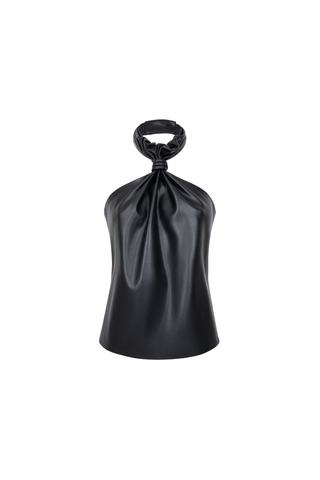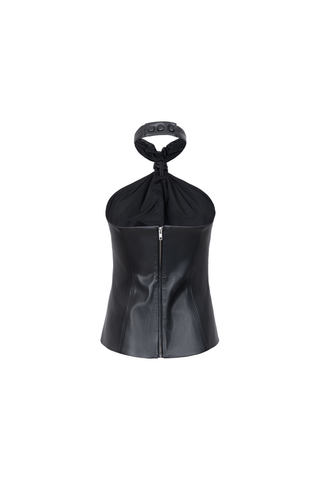 FAUX LEATHER SEMI-FITTED HALTER NECK TOP. COLLAR WITH SNAP BUTTON CLOSURE. BACK ZIP CLOSURE