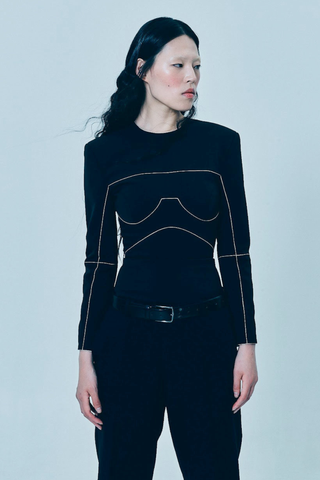 FITTED LONG-SLEEVE TOP DECORATED WITH WHITE RIBBONS IN THE SEAMS, ZIPPER FASTENING AT THE BACK